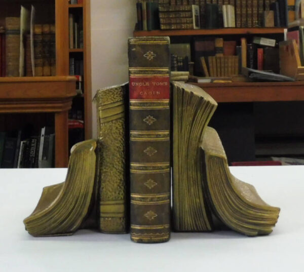 Uncle Tom’s Cabin, With A New Preface Expressly Written For This Edition, Authorized For The Continent Of Europe, Stowe, Harriet Beecher. Published by Bernhard Tauchnitz, Leipzig, 1852. From the Collection of British Authors; Volume One: CCXLIII. Volume Two: CCXLIV. 16mo up to 6½” tall. Volume One: 352pp. with frontis portrait of Harriet Beecher Stowe; preface; title; contents. Volume Two: 317pp., with half-title; table of contents; 2 frontis illustrative plates: “Scenes Under The Shadow Of American Law”; “Uncle Tom’s Death”. Half green leather, marbled boards, marbled endpapers, all edges marbled. Banded spine with florets in gilt. Contents appear in unread condition with an occasional light foxing mark; very light toning; pastoral bookplate to blank page. Boards in very nice condition with rubbing to edges. This rare copy was published in the same year as the first edition, with copyright authorized for the European market.
