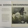 USSR Illustrated Monthly Magazine – A Good Beginning, July 1961. Published by Embassy of the Union of Soviet Socialist Republics, Washington DC, 1961. Oversized magazine; staple bound with color and black/white illustrations throughout. 62 pages plus covers. In near fine condition, binding tight, without tears or creases; very tiny front corner folds; light fading along spine; small black printing mark on Khrushchev’ face.