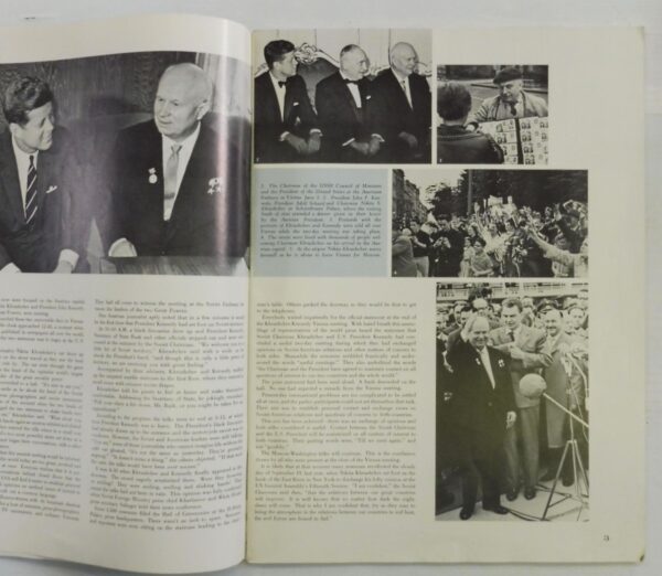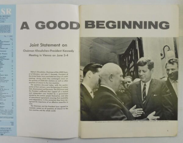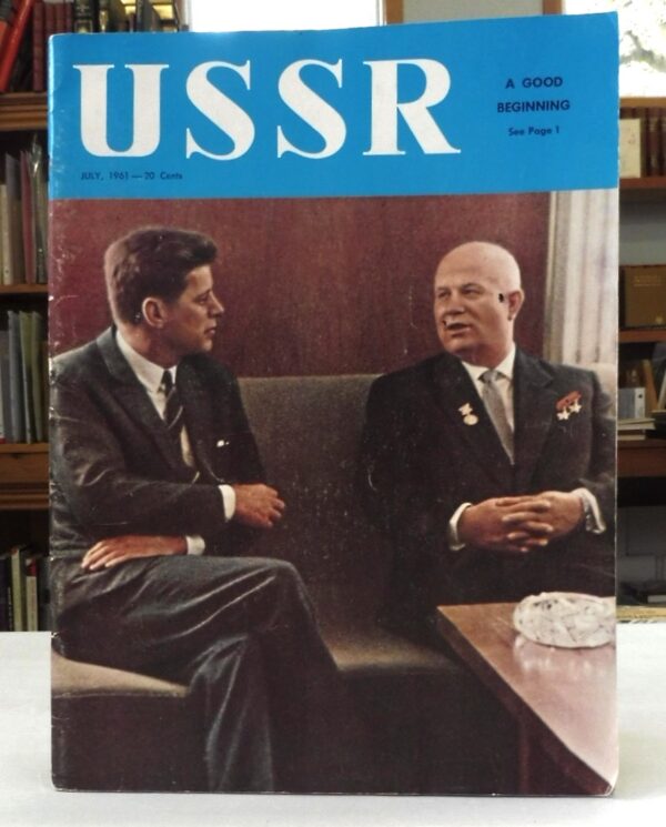 Cover photo and feature story with additional full-page photos focuses on the Vienna Meeting June 03/04 1961 between USA President Kennedy and Chairman Nikita Khrushchev. Contents include the Joint Statement by Kennedy and Khrushchev; USSR Seven Year Plan; Communist Party Organizational Principals; The Road to Outer Space by Yuri Gagarin “Pilot Cosmonaut Of The USSR, Hero Of The Soviet Union”; Letter To My American Friends by Yuri Gagarin This Must Not Happen Again by artist Boris Porokev with 3 full size pages of art; Ivan Michurin – Science and Agriculture; plus several ads including one for Cameras Made in the USSR. 000953 $60