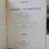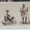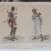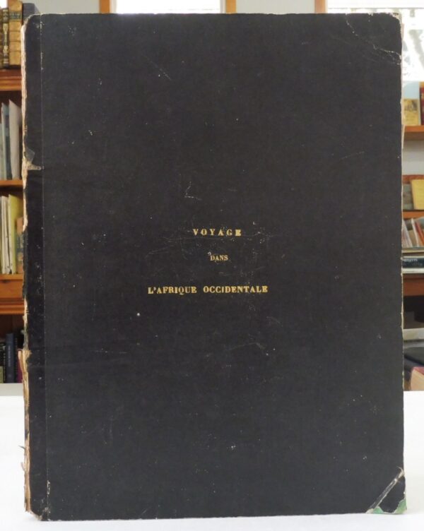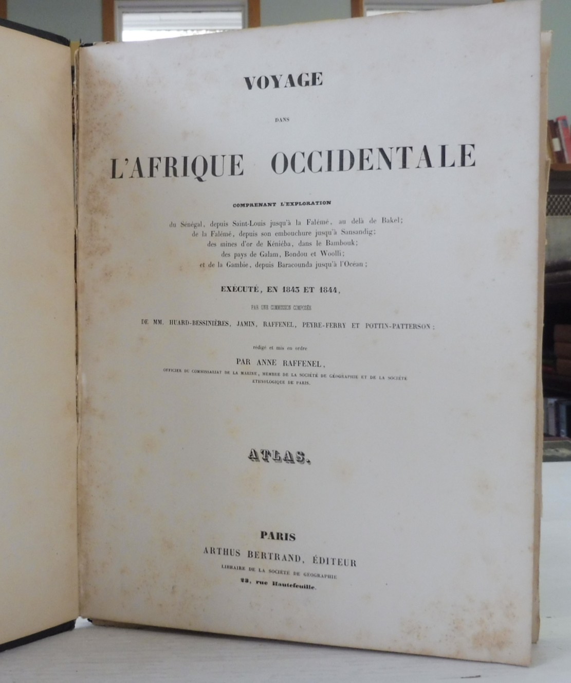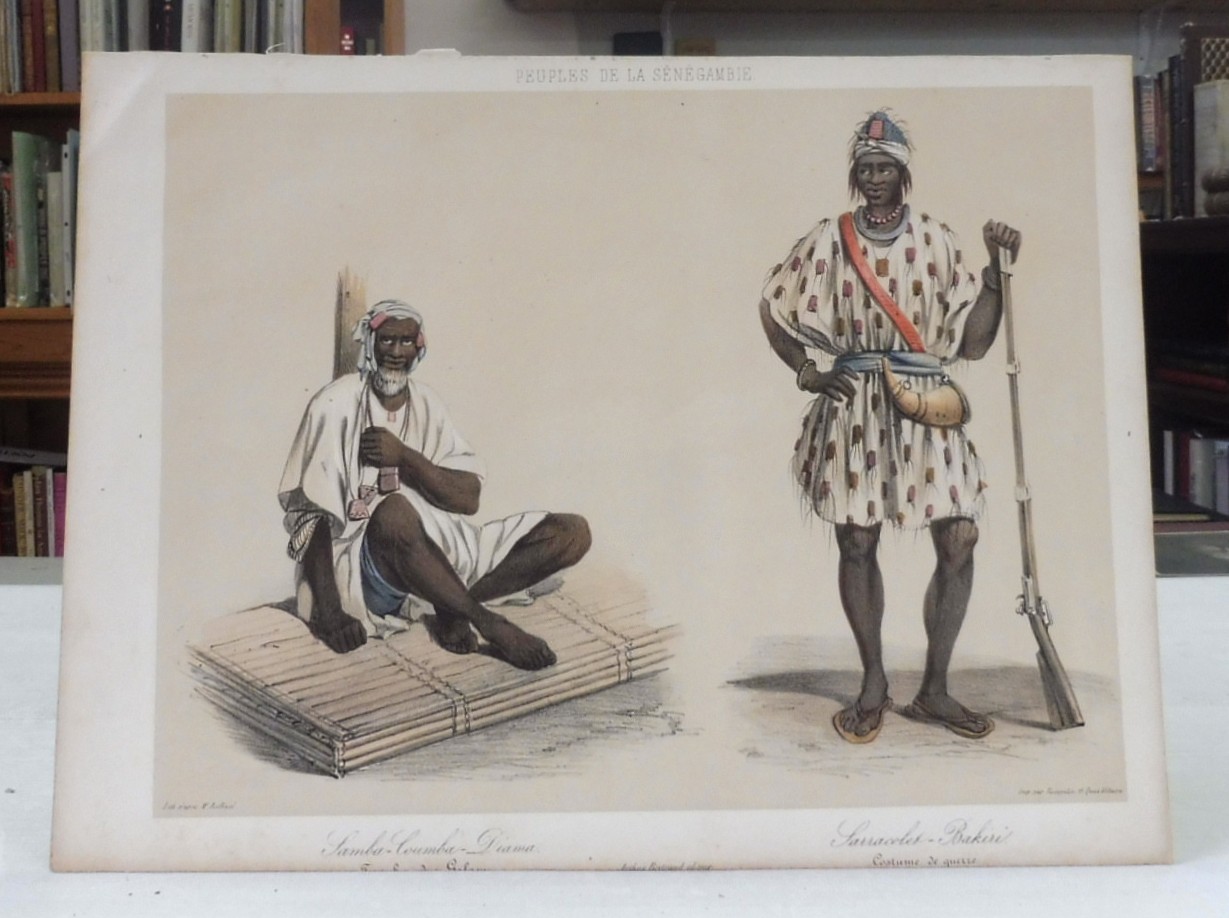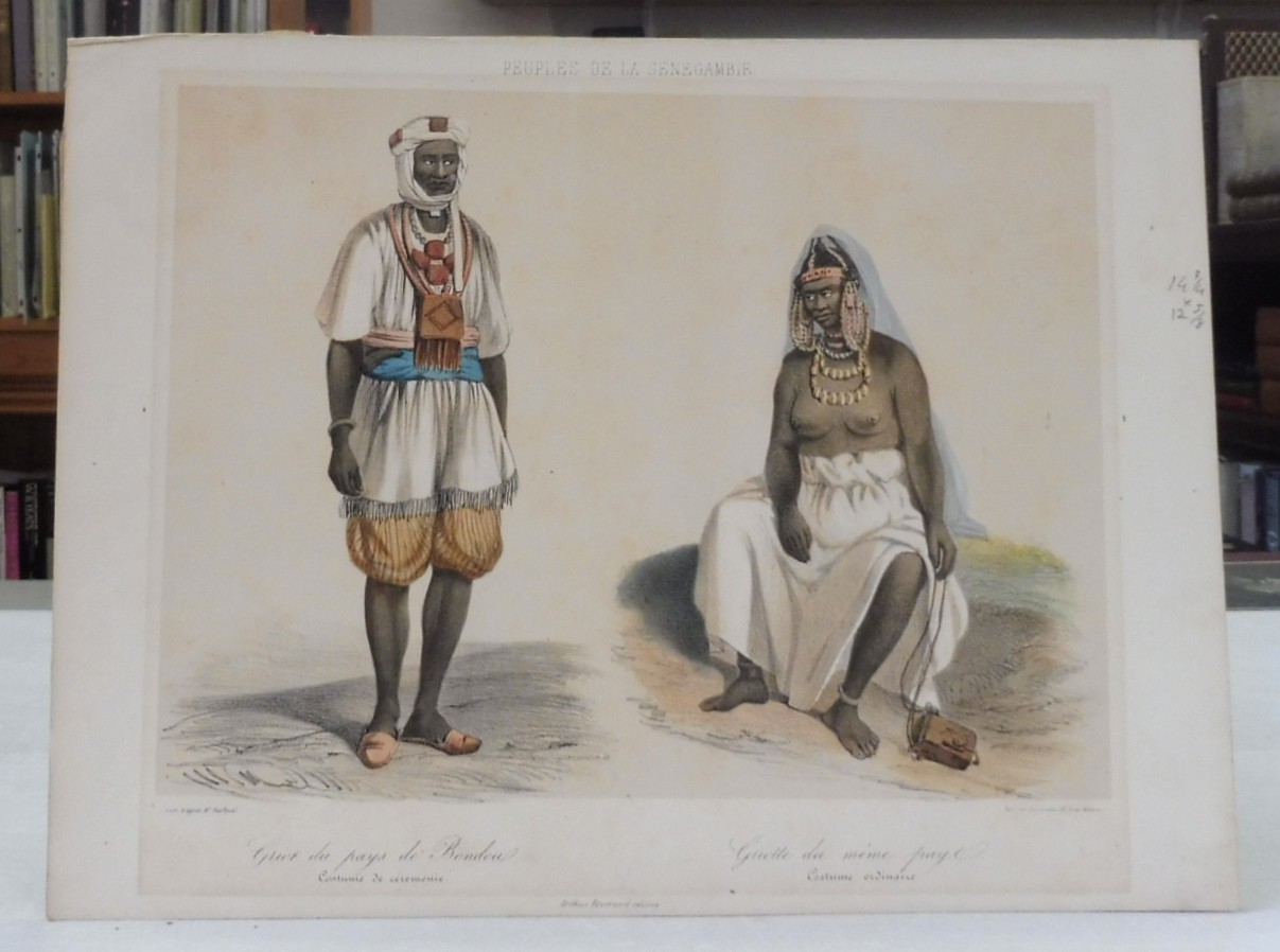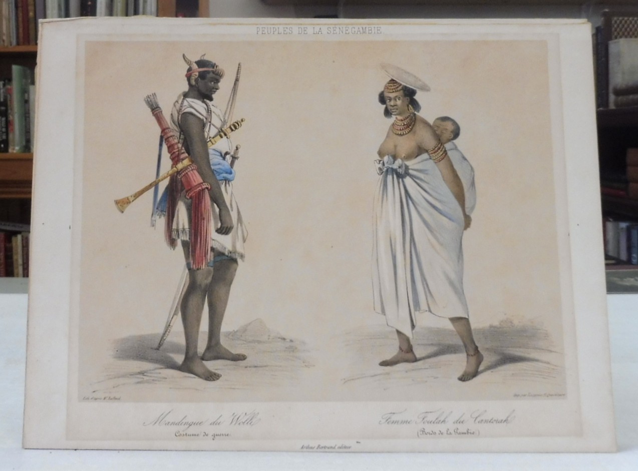 Voyage dans l’Afrique occidentale, Anne Raffenel. Published by Arthus Bertrand, Paris, 1846. Atlas. Two lithographed folding maps and 7 of 11 hand-colored lithographs. Folio up to 15″ tall. Map 1: part of the course of the Senegal, the Falémé and the Gambia and Map 2: part of the Falémé between Sansandig and its mouth in the Senegal. Plates: 3. Jeune negre du Wallo / Coiffure particuliere des jeunes genre du Boudon Meidionale. 4. Griot du pays de Galam. Touant du tam-tam / Costume porte par les jeunes negres. Pendant le mois qui precede la Circoncision. 5. Samba-Coumba-Diama. Tounka du Galam / Sarracoler-Bakiri. Costume de guerre. 6. Maure Dorviche / Negre blanc. 7. Girot du pays de Bondou. Costume de ceremonie / Griotte du meme pays. Costume ordinaire. 8. Mandingue du Bambouk. Costume ordinaire / Bambara. Costume de guerre. 11. Mandingue du Wolli. Costume de guerre / Femme Foulah du Cantorah (Bords de la Gambie).
