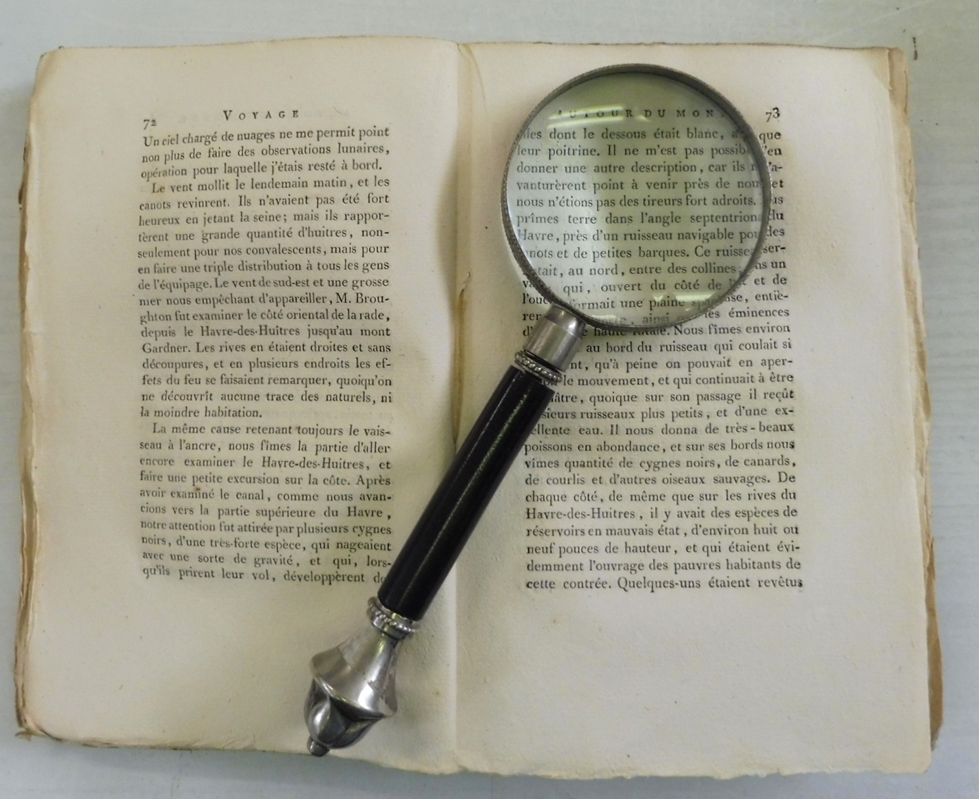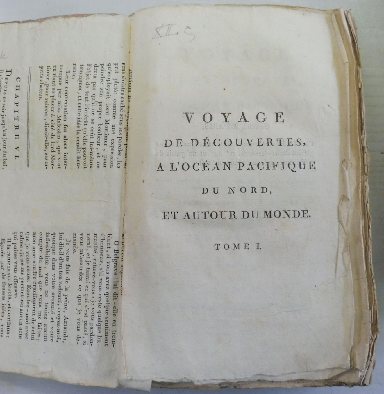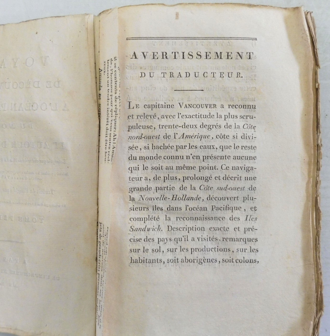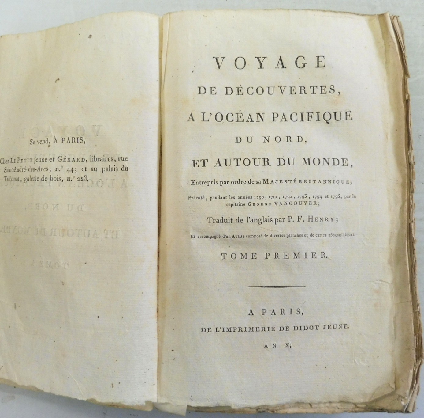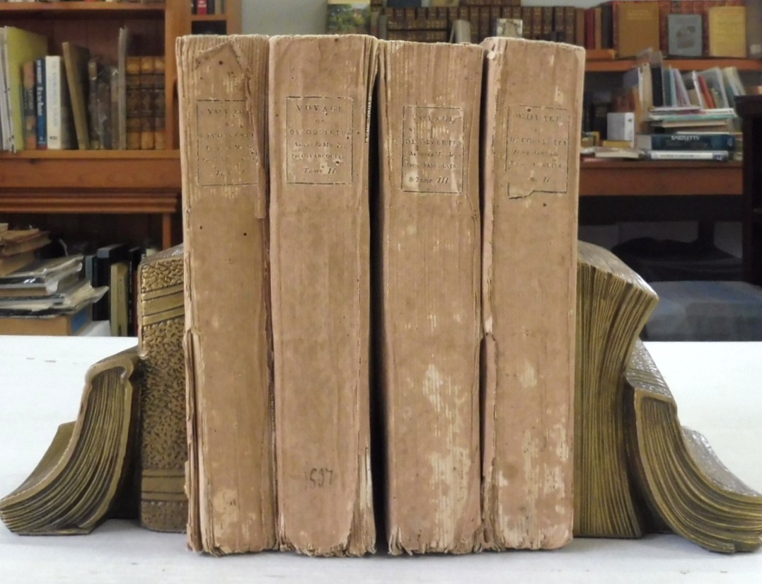 Voyage de Decouvertes, a l’ocean Pacifique du Nord, et Autour du Monde, Entrepris par ordre de sa Majeste Britannique; Execute, pendant les annees 1790, 1791, 1792, 1793, 1794 et 1795, par le Capitaine George Vancouver. Vancouver, Captain George; Translated from the English by P.F. Henry. Published by De l’Impreimerie de Didot Jeune, Paris. Circa 1800. Volumes 1-4. 8vo up to 9½” tall., 341pp; 384pp; 381pp; 368pp. Each with half titles. Without plates or maps. In original paper wraps with paper spine labels, front wraps cover three quarters of volumes; rough cut edges; printer paper stubs at title pages. Contents have edge toning and are otherwise in fine condition and binding remains tight. Fading to spine labels, one cover detached.