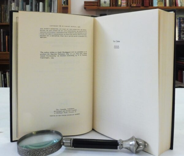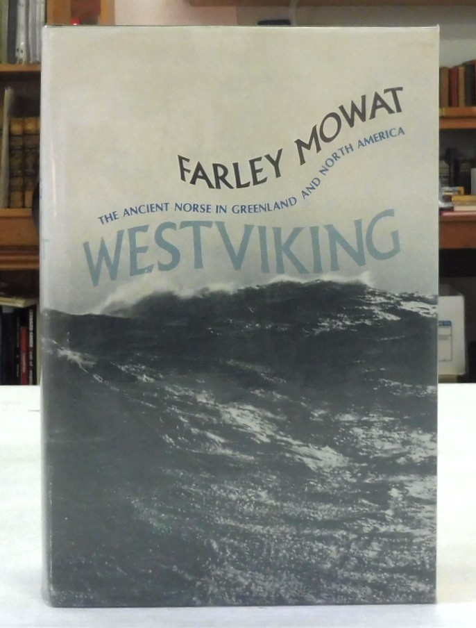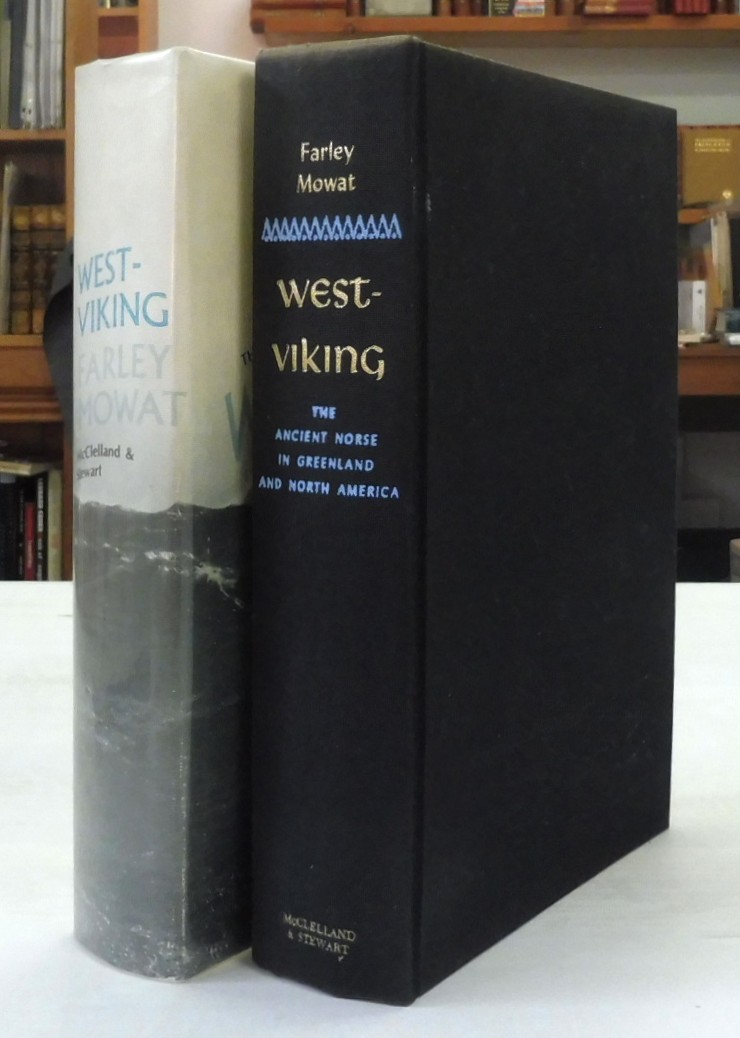 West Viking: The Ancient Norse in Greenland And North America, Mowat, Farley. Published by McClelland & Stewart, Toronto, 1965. First Edition, First Printing. 8vo up to 9½” tall., 494pp., with illustrations, maps, chronology, index.. Black cloth boards with and gilt and blue spine titles, mapped endpapers. In very good condition with a tiny closed tear to top edge of title page, tiny inked name to half title, light toning. Dustjacket has a taped-on plastic protective cover.